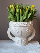 De vaas weerspiegelt de ontwerpstijl van Marie Michielsson, waarin de handen en ogen van vrouwen centraal staan. Met oog voor perfectie zijn de hoofdtooien en kleding van de vrouwen gedetailleerd, in contrast met de ruwere afwerking van de chamotte klei. De binnenkant en de onderkant van de vazen zijn bedekt met een transparante matte glazuur.