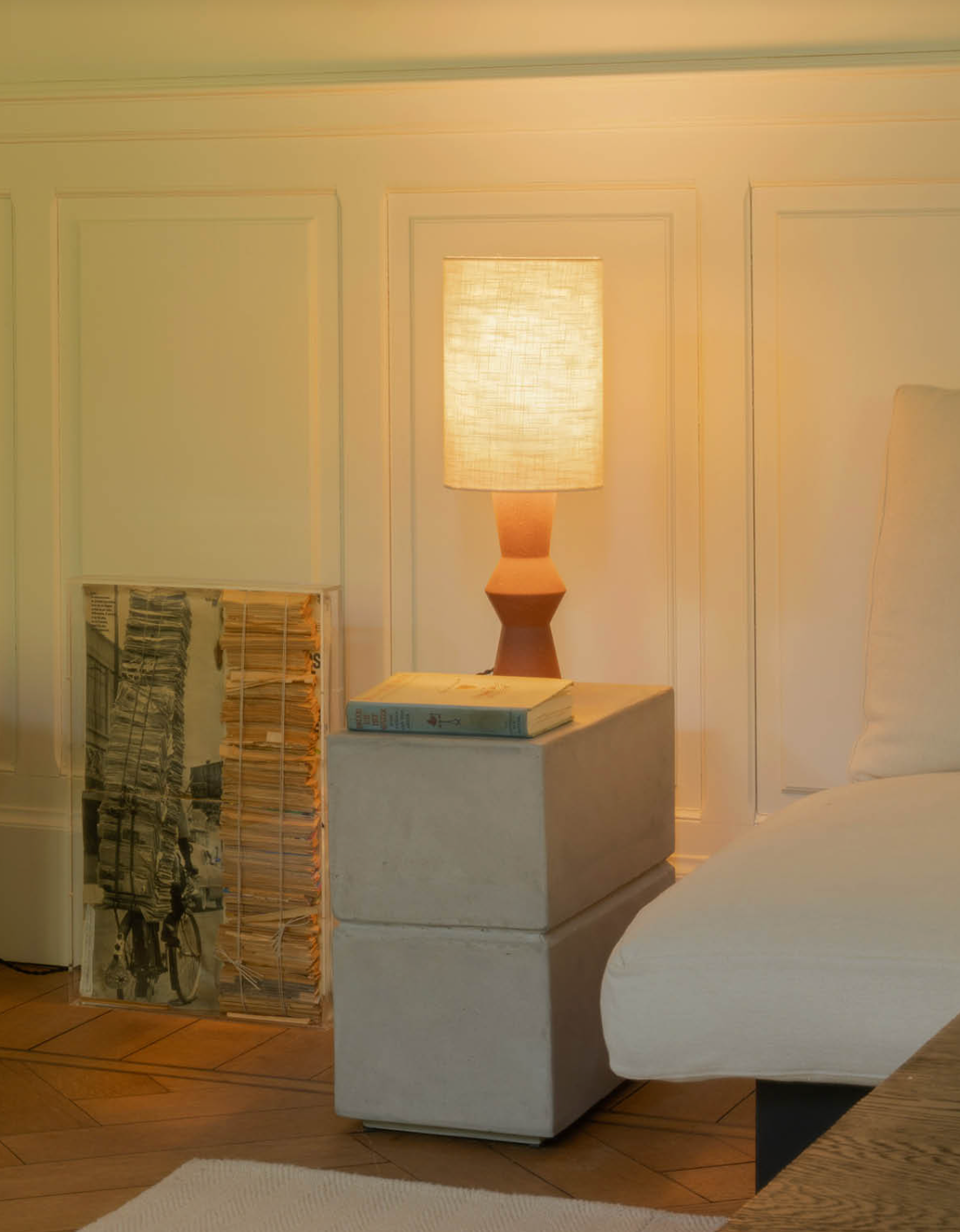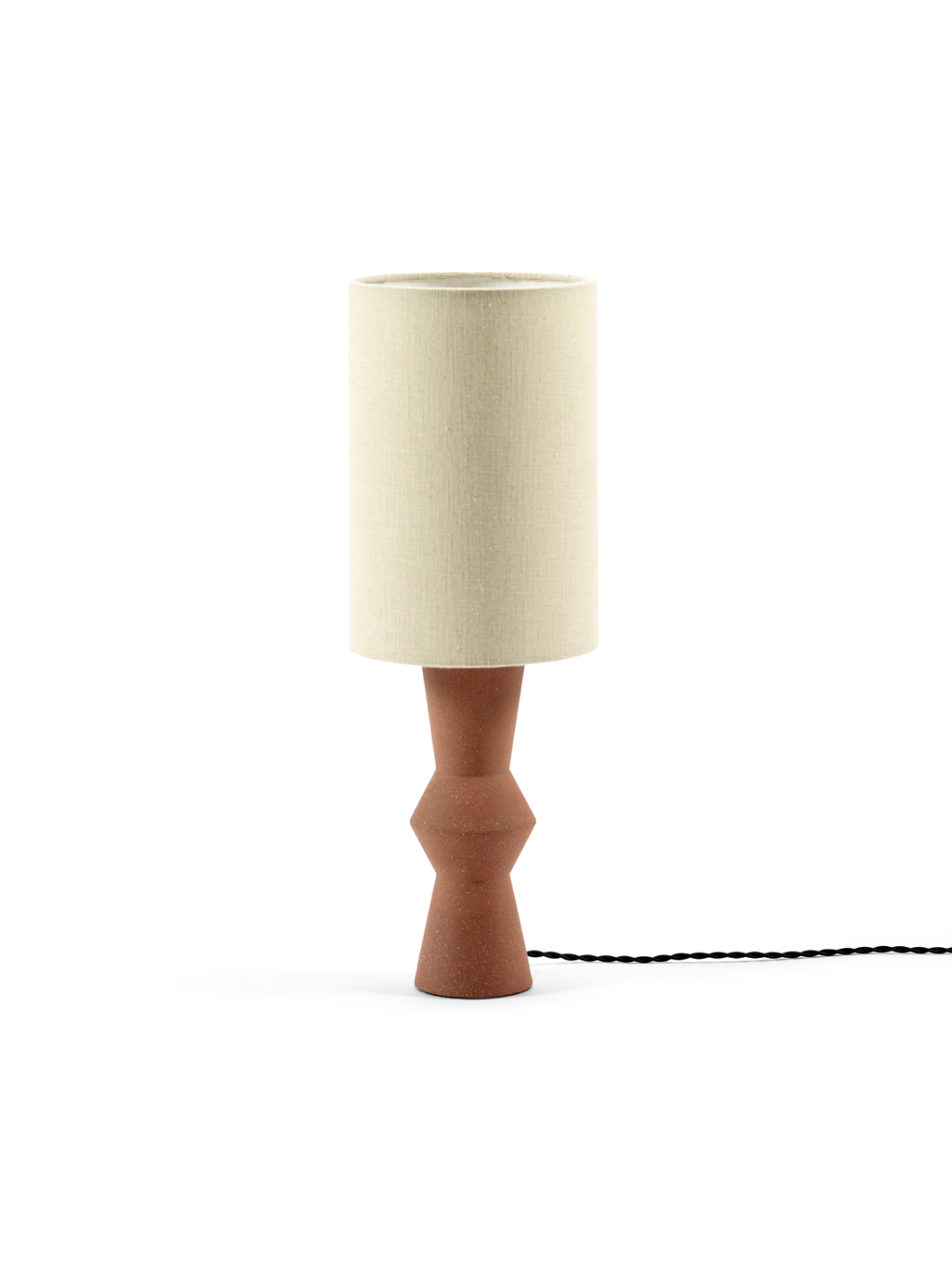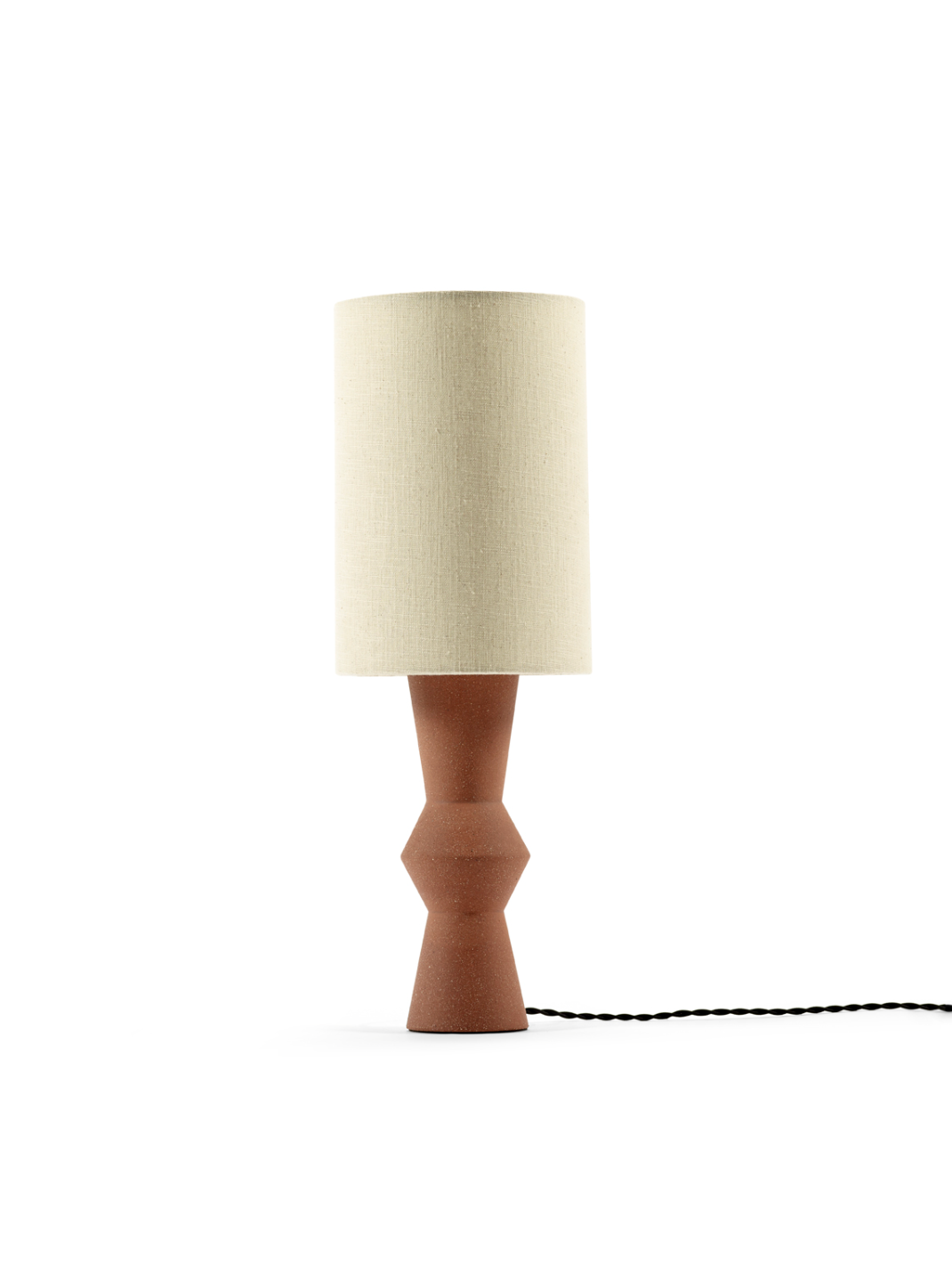De Marie-Ann collectie van huisontwerpster Marie Michielssen omvat niet alleen vazen en kandelaars, maar ook een verfijnde tafellamp en een staande lamp die dezelfde designtaal volgen. Beide lampen staan op een slanke voet van roodbruin terracotta gegoten klei met daarboven een hoge, smalle linnen lampenkap. Een subtiel detail is het nostalgische stoffen 'ijzeren koord', dat extra klasse toevoegt. Het geheel oogt ingetogen chic en tijdloos, dankzij de combinatie van de warme materialen en de elegante vorm.